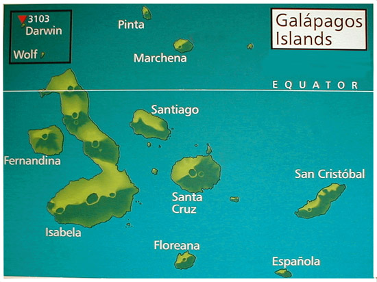 Located on the equator about 600 miles west of Ecuador’s mainland, the Galapagos Archipelago is a chain of islands -- 13 large islands, 6 small islands, 42 islets and a number of small rocks and pinnacles. The islands were formed when a group of submarine volcanoes grew from the ocean floor, until they finally emerged above sea level about 3.5 million years ago – relativity new for this old world. In fact, the youngest of the islands is Fernandina and only about 300,000 years old. Newer islands are forming as I write. Each island is formed from a single volcano, with the exception of Isabela, the largest island made up of 6 volcanoes strung together. The oldest island is Isla Española in the South west, while Fernandina and Isabela in the northwest are the youngest and most volcanically active.