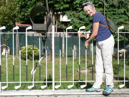 Nancy trying to figure out how to putt with a fence post |